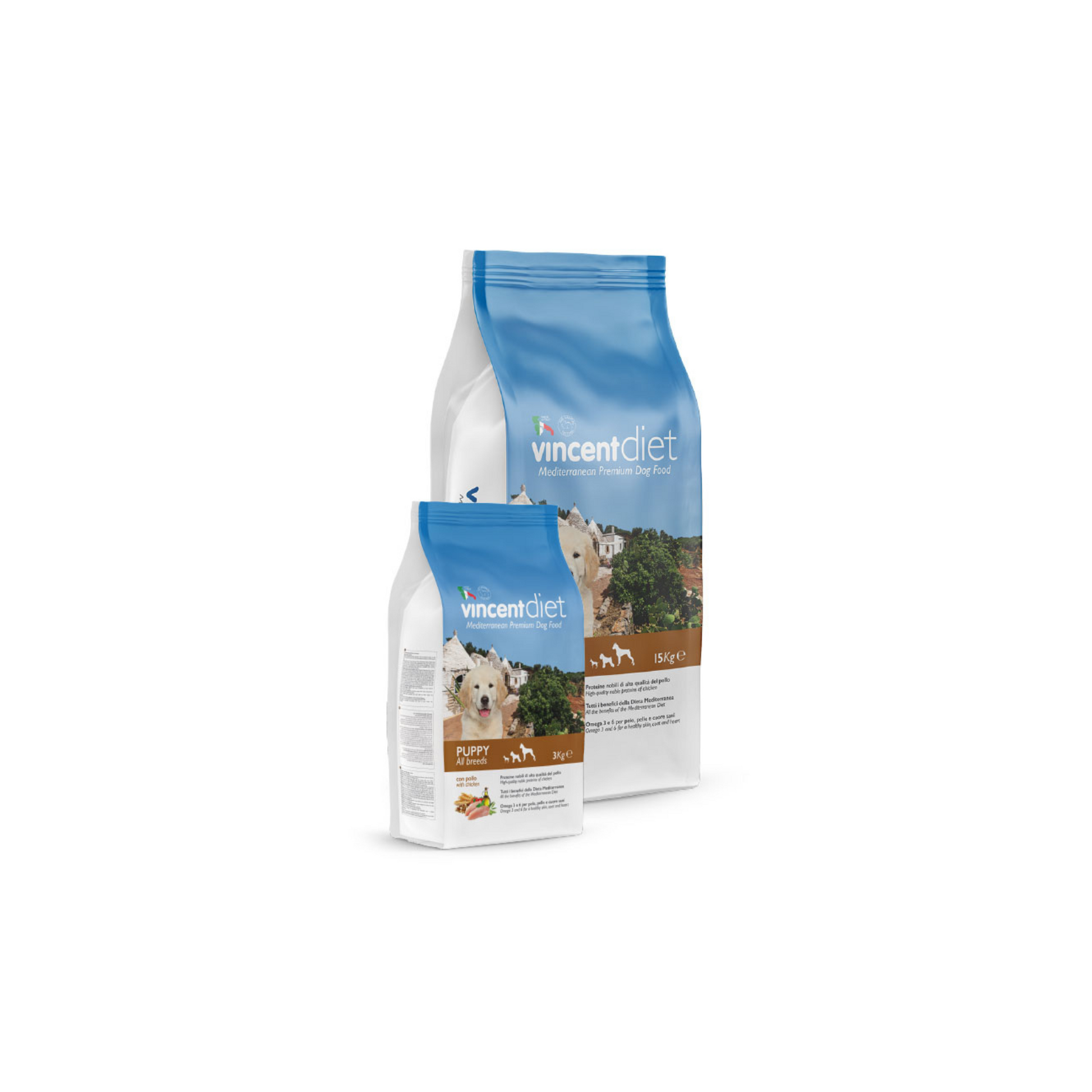 Puppy All Breeds con pollo è un alimento completo e bilanciato per cuccioli di cane di tutte le razze. L’alto contenuto di pollo (31%) di alta qualità, insieme all’equilibrato apporto di fibre (grano duro), lo rende particolarmente adatto ai cuccioli in fase di crescita. Ideato con l’utilizzo di ingredienti naturali presenti nella Dieta Mediterranea (olio di oliva, grano duro, pomodoro, legumi), questo alimento favorisce l’alta digeribilità e il benessere intestinale. L’utilizzo di olio di oliva regola il corretto rapporto nell’assunzione di acidi grassi Omega 3 e 6 per pelo e pelle sani e il pomodoro garantisce l’assorbimento di antiossidanti per rafforzare il sistema immunitario.